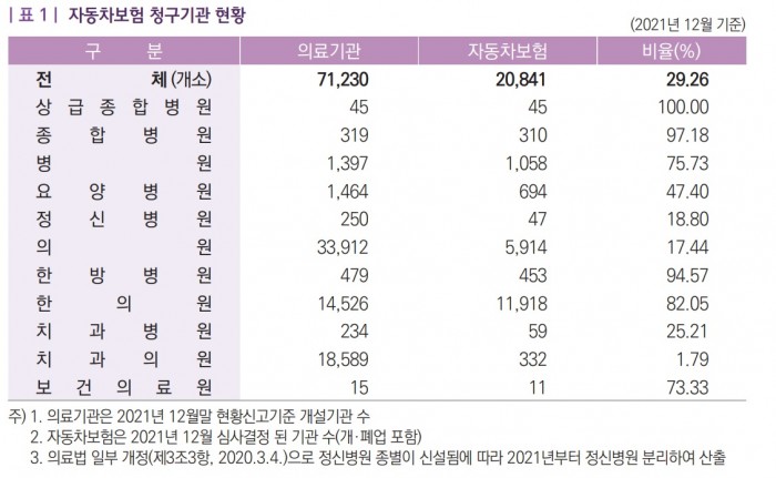 또한 자동차보험 청구기관은 지난해 12월 기준으로 2만841개소로 나타나 개설 의료기관의 29.26%를 차지하고 있었고, 한의원과 의원이 청구기관 중 85.56%를 점유하고 있다.