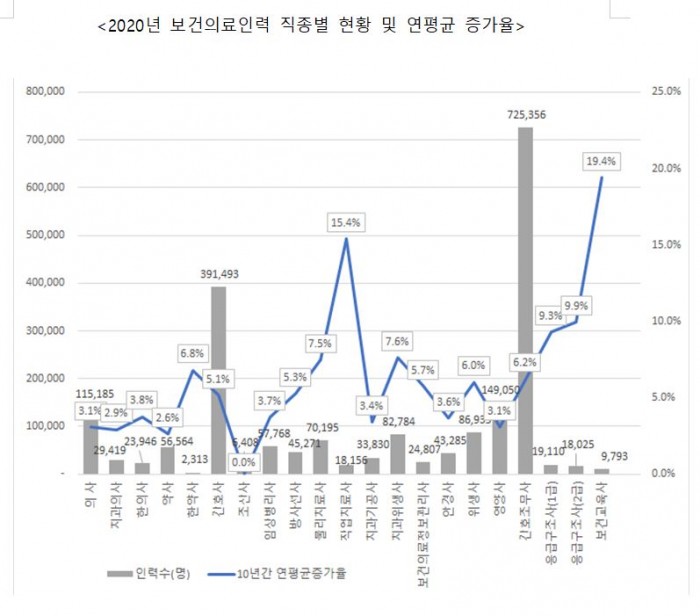다음으로는 의사가 11만5185명으로 전년 대비 3000명, 2010년 대비 3만45명 늘어 연평균 3.1% 증가했다.