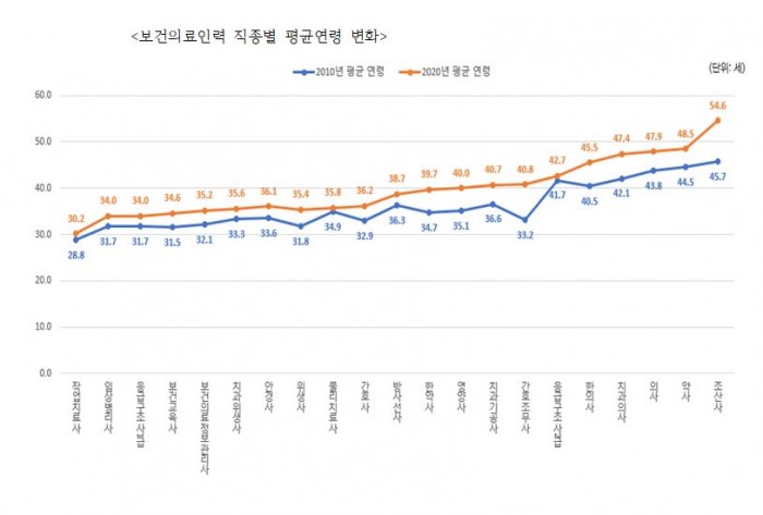 치과의사는 평균 47.4세로 같은 기간 5.3세가 증가했고, 약사는 48.5세로 4세가, 간호사는 36.2세로 3.3세가 증가한 것으로 파악됐다.