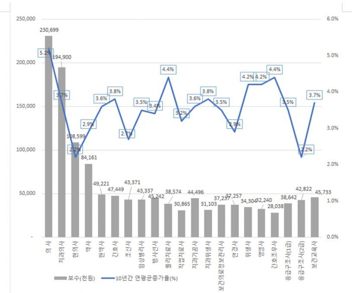10년간 임금이 가장 빠르게 증가한 직종은 의사로 연평균 증가율은 5.2%이며, 한의사(2.2%)와 응급구조사 2급(2.2%)는 가장 적게 증가한 것으로 드러났다.