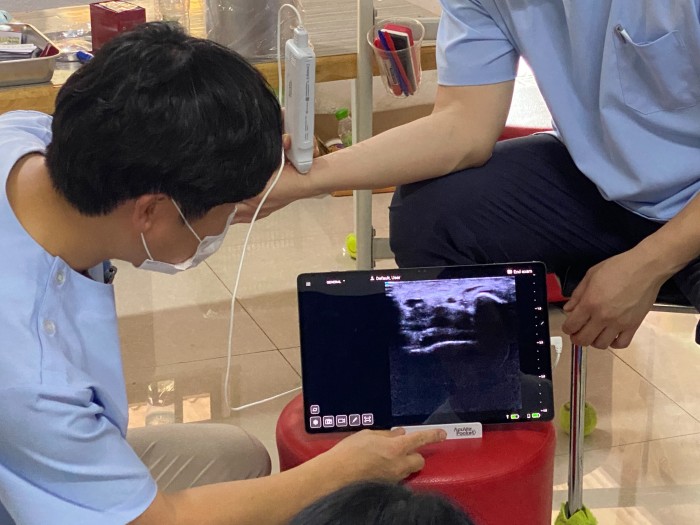 한의사 및 학부생 대상 초음파 강의 함께 간 한의사들과 한의과대학 학부생을 대상으로 초음파 진단기기에 대해 개괄적으로 설명하는 시간을 가졌다. 휴대용 초음파 진단기기는 특히 천부의 연부조직을 관찰하는데 탁월하기 때문에 그러한 조직들을 관찰하는 프로토콜과 해당 영상들을 설명하는 방식으로 진행했다.