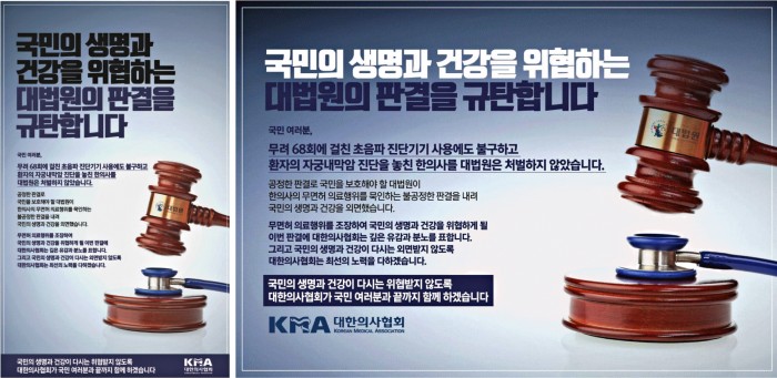 의사협회는 이 같은 대법원의 판결에 승복하지 않고 그동안 대법원 앞 1인 시위와 기자회견 등을 개최한데 이어 지난 5일 일간지 광고를 게재해 한의사들의 초음파 진단기기 사용에 대해 지속적으로 적대감을 나타내 보였다. 고소인들은 의사협회가 신문 발행부수가 많은 주요 일간지의 1면에 큰 비용을 부담하면서까지 적극적으로 광고를 낸 것은 판결의 의미를 폄훼해 한의사들의 사회적 평가를 저하시키려는 의도로 판단했다. 이에 고소인들은 의협이 한의사들에 대한 허위의 사실 내지 경멸적 감정이 표현된 이 사건 문구를 불특정, 다수인이 볼 수 있는 주요 일간지에 게재해, 공연히 한의들의 명예를 훼손한 것에 대해 형법 제309조 제2항에 따라 처벌해 줄 것을 요청했다. 형법 제309조 2항은 신문, 잡지 또는 라디오 기타 출판물을 통한 적시로 사람의 명예를 훼손할 경우 7년 이하의 징역, 10년 이하의 자격정지 또는 1천5백만 원 이하의 벌금에 처하도록 돼 있다.