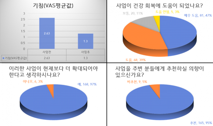전체적으로는 대상자들의 사업 전 관련 증상 VAS 총점이 4609점에서 사업 후 2157점으로 감소하며, 약 53%의 주관적인 증상 호전도를 보였다. 사업 만족도 조사에서도 ‘매우 도움 됐거나 도움이 됐다’는 응답이 86%, 본 사업을 추천하거나 확대해야 한다는 의견이 95%, 97%으로 높은 만족도를 보였다.
