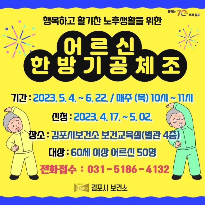 ‘어르신 한방기공체조 교실’ 신청 대상은 60세 이상 어르신 50명으로, 내달 2일까지 김포시보건소 건강증진팀으로 신청하면 된다.