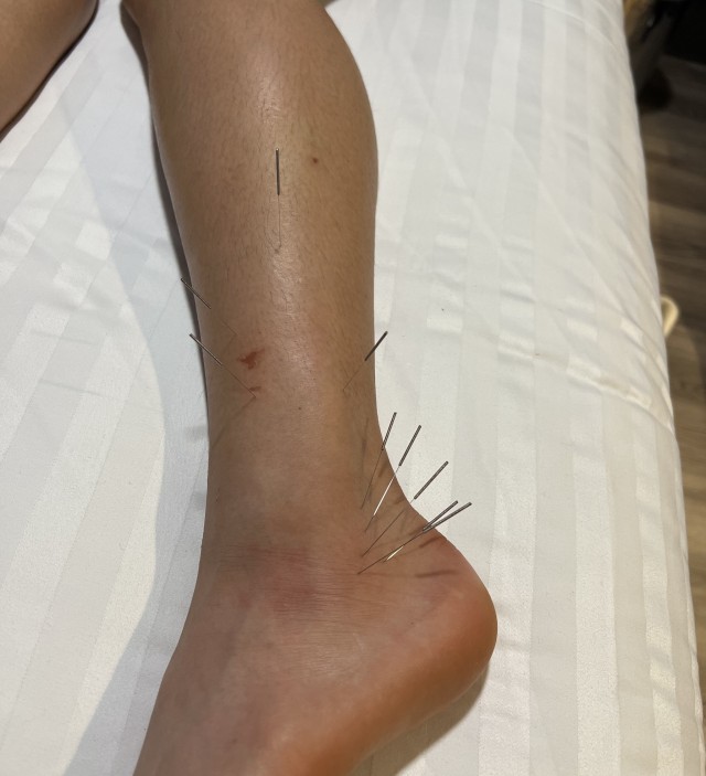 A. 진료를 준비하면서 침, 약침, 도침, 추나요법 등을 모두 사용하겠다는 계획을 세웠습니다. 이전에 안 선수가 약침 치료 이후 뻐근한 느낌이 지속되는 편이라 초반에는 골반대부터 발목까지 침 치료 실시하고, 건 부위는 도침 치료, 발목은 추나 치료를 같이 실시했습니다. 이후 어느 정도 효과를 보인 후에는 8강, 4강, 결승전을 앞두고 침 치료와 추나 치료를 실시했습니다.