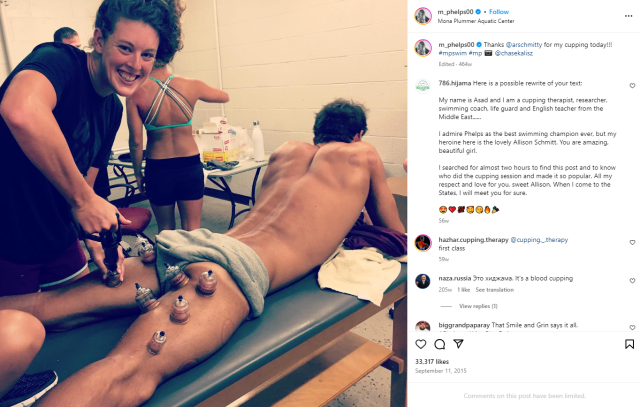 당시 펠프스는 “주로 어깨가 많이 아프기 때문에 부항 치료를 받는다”고 밝혔고, 이와 관련 AP통신도 “부항 치료 덕분에 펠프스가 31세 나이에 5번째 올림픽에 출전해 금메달까지 거머쥘 수 있었던 건지도 모른다”는 분석을 내놓기도 했다.