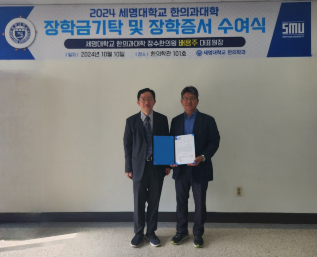 지난해에 이어 올해도 200만원 전달…지속적인 사랑나눔 ‘눈길’![]() 세명대학교(총장 권동현) 한의과대학이 10일 한의학관 학장실에서 한의과대학 졸업생의 장학금 기탁 및 장학증서 수여식을 개최했다. 이번 장학금 기탁자는 세명대학교 한의과대학 96학번 졸업생인 배용주 원장(단양 장수한의원)으로, 학생들의 학업과 생활에 도움을 주고자 장학금 200만원을 기탁했다. 이에 앞서 배 원장은 지난해 8월에도 장학금을 기탁한 바 있다. 장학금 수혜자들은 재정적인 도움이 필요한 학생들 중 학업성적이 우수하고 성실한 학과 생활로 타의 모범이 되는 자를 선발했다. 세명대 한의과대학 조학준 학장은 “장학금을 흔쾌한 마음으로 기탁해준 배용주 원장님께 감사드린다”며 “장학금을 수탁받은 학생들은 어려운 시기에 좋은 지원을 받은 만큼 졸업생 선배님에게 감사하는 마음을 갖고 자랑스러운 세명대인의 자긍심을 지닌 훌륭한 인재로 성장해서 사회에 봉사할 수 있기를 바란다”고 당부했다. 한편 배용주 원장은 20여 년간 소외계층을 대상으로 의료봉사를 지속하는 것은 물론 세명대학교 이외에도 제천시인재육성재단, 단양군장학회에 매년 장학금을 기탁해 오고 있다. 또한 지난해에는 ‘아름다운 납세상’과 ‘기획재정부 장관상’을 수상하는 등 타의모범이 되고 있다. |