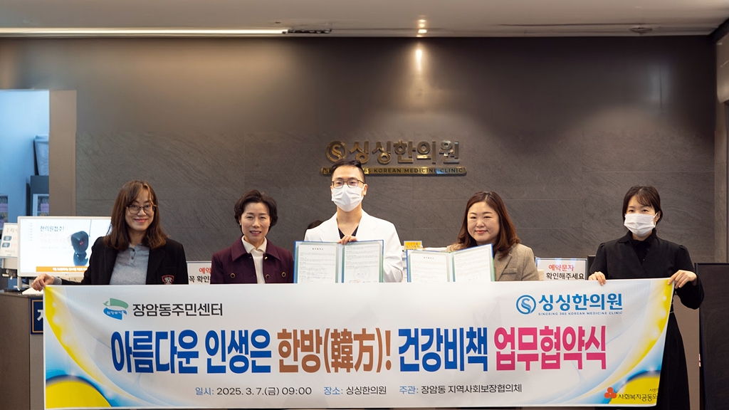 이번 업무협약을 통해 장암동과 싱싱한의원은 도움이 절실한 주민들에게 한의학적 치료를 비롯한 다양한 복지서비스를 제공할 예정이다. 특히 싱싱한의원은 이번 사업을 통해 발생하는 모든 수익을 지역사회에 전액 기부하기로 해 복지재원 순환과 나눔의 의미를 더했다.